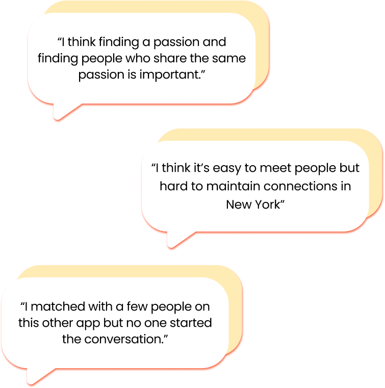 To understand the challenges of making friends as an adult, we conducted user interviews and synthesized findings into key themes. Our research focused on young adults in New York City navigating transitional life stages, where building new social connections is a high priority.