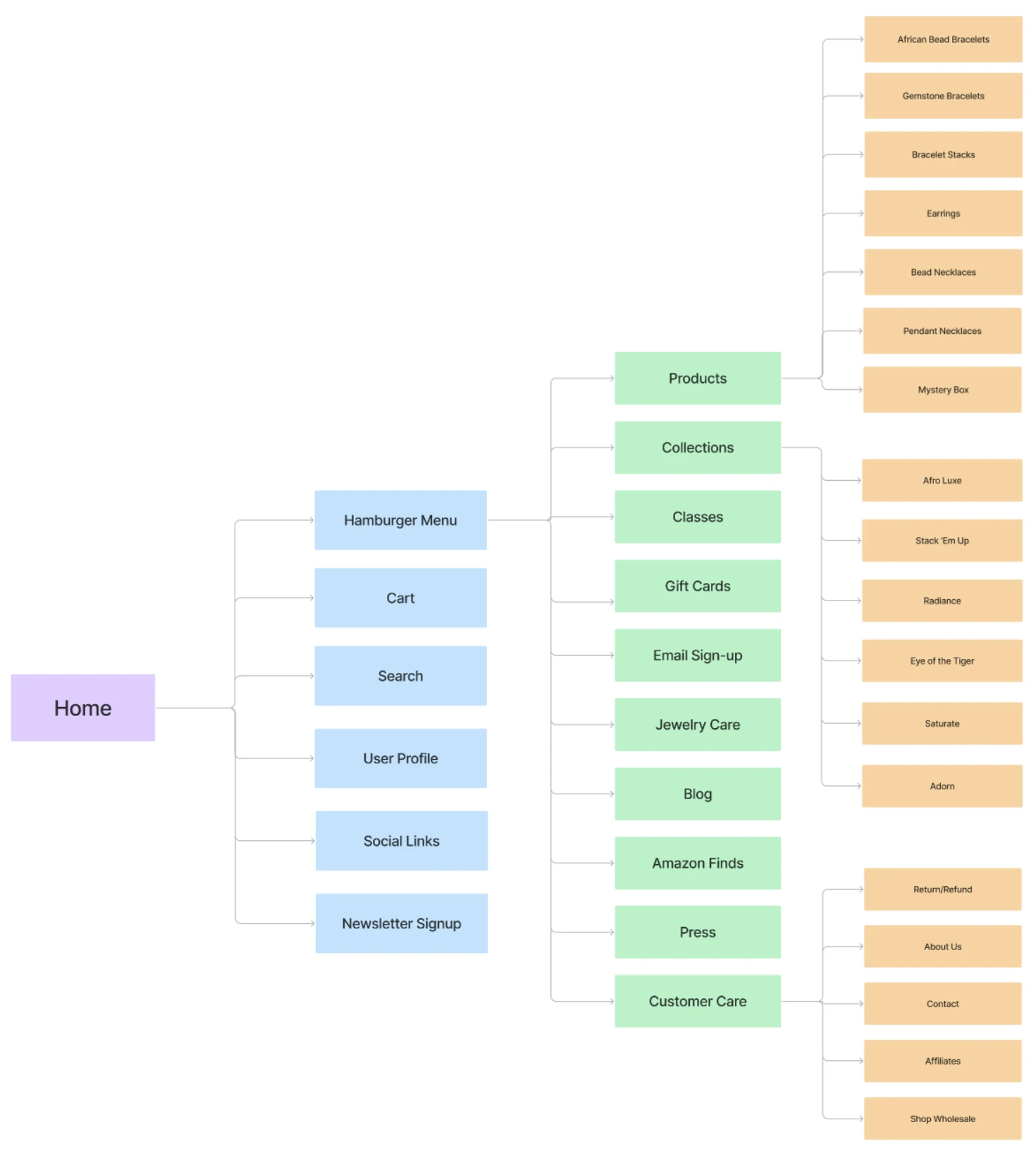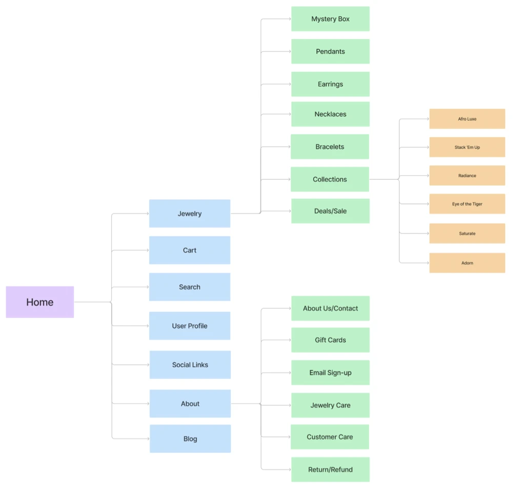 To make sure that the site’s information architecture was aligned with user expectations, we held a remote card sorting session using Figjam. Our goal was to find intuitive groupings for the existing 28 menu options. After organizing the data, we ended up with 3 clearly defined global navigation categories ('Jewelry', 'Home', and 'About').