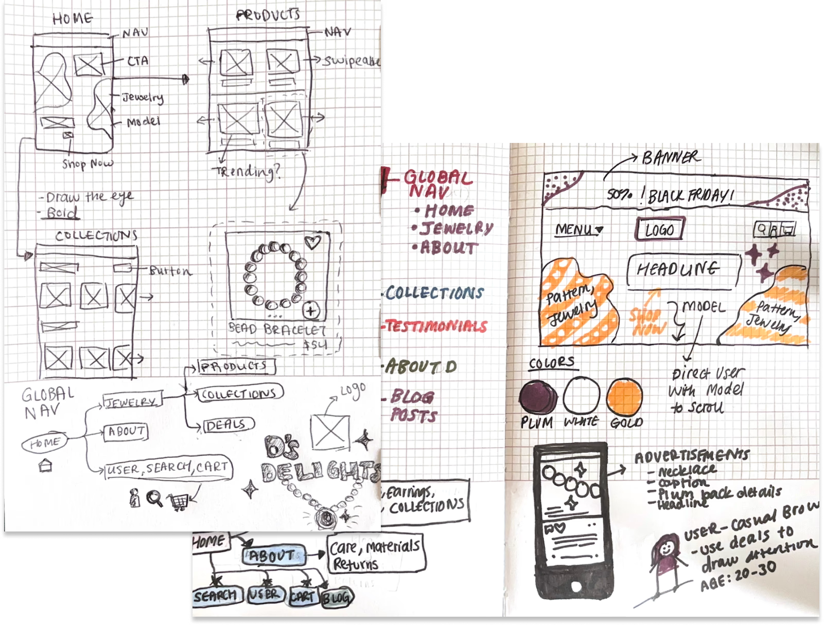 I began with low-fidelity sketches and wireframes to visualize ideas from our ideation phase