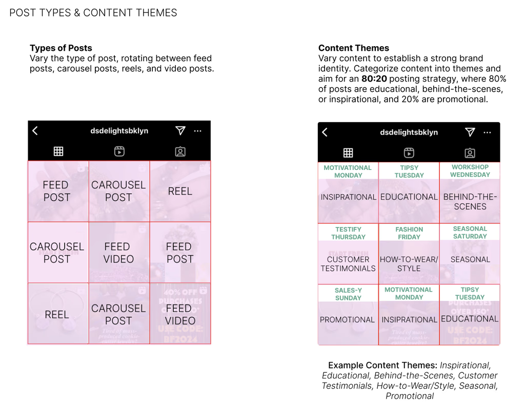 Balanced mix of feed posts, carousels, reels, and video content