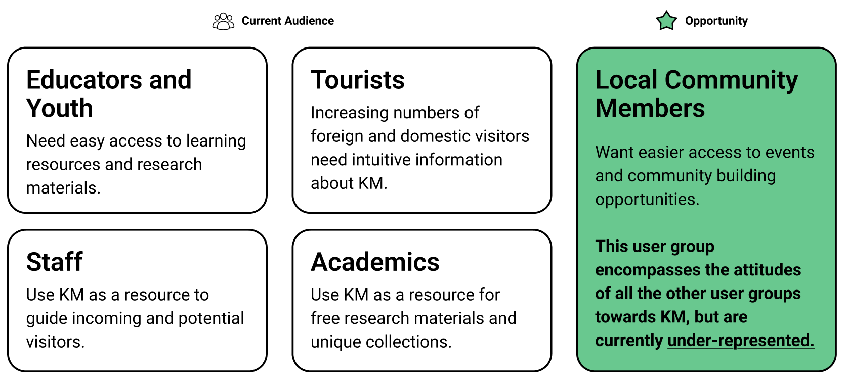 Our design needed to serve a variety of current and target audiences who interact with the museum (KM) in different ways:
